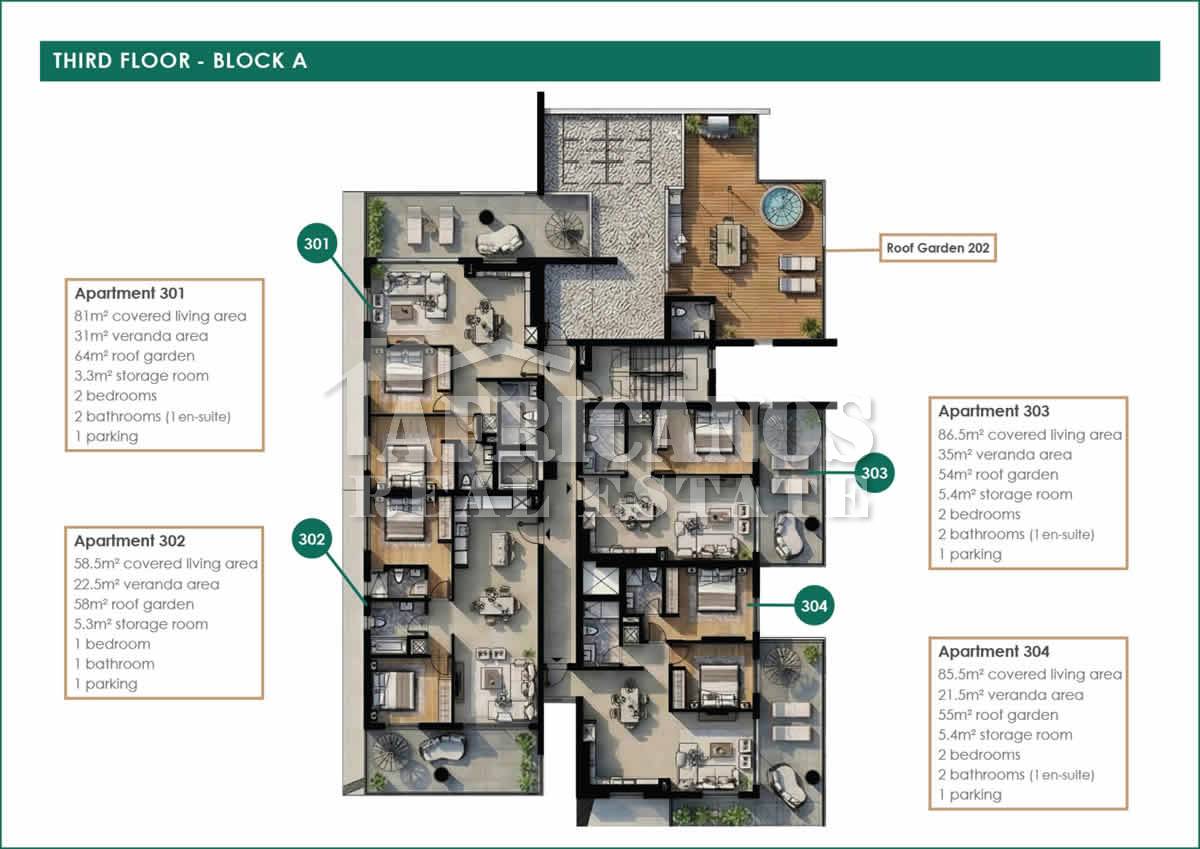 #Apartment for sale in Larnaca Kiti area. The property consists of 1 bedroom, open plan kitchen, living room, 1 bath, 2wc, common pool, gym, external showers, changing rooms, lounge, sitting area, private jacuzzi on the roof with wc and bbq, playground, 23sq.m. covered verandas, 58sq.m. roof garden with wc, covered parking, storage, Class A Energy Sufficiency.