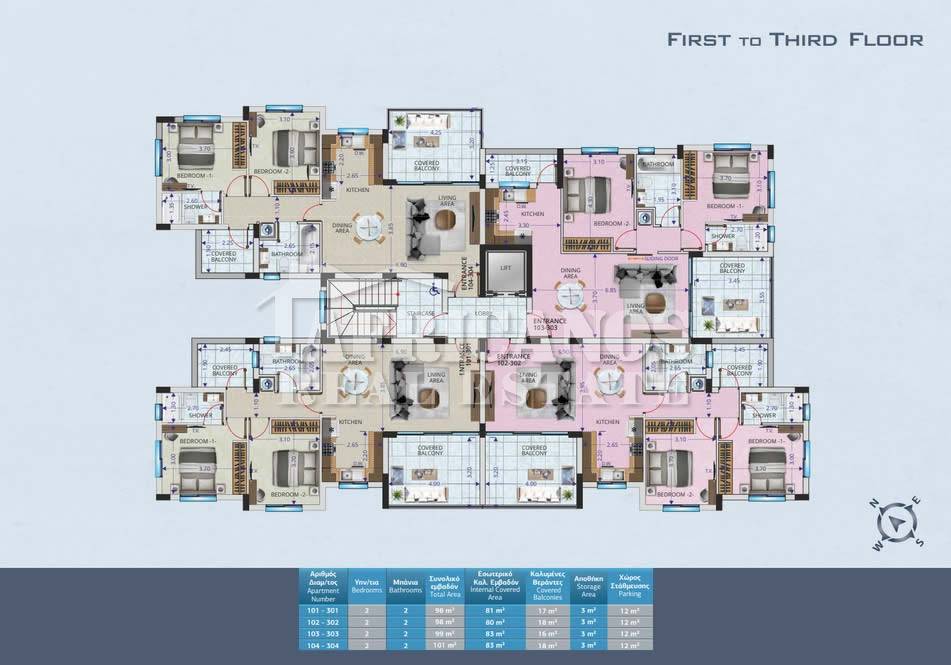 #Apartments for sale in Larnaca. The properties consist of 2 bedrooms, open plan kitchen, living room, 1 bath, 1 shower en-suite, 2wc, covered parking, storage, 16 - 19sq.m. covered verandas. Class A Energy Sufficiency.